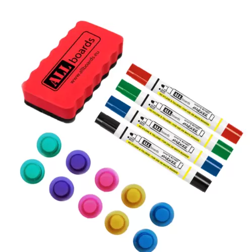 Zestaw – gąbka magnetyczna + 4 markery suchościeralne + kolorowe magnesy